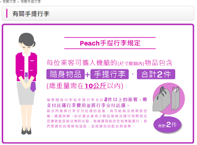 再來很重要的一點,請清楚了解搭乘的航空公司提供的手提行李限重多少,還有尺寸規定
